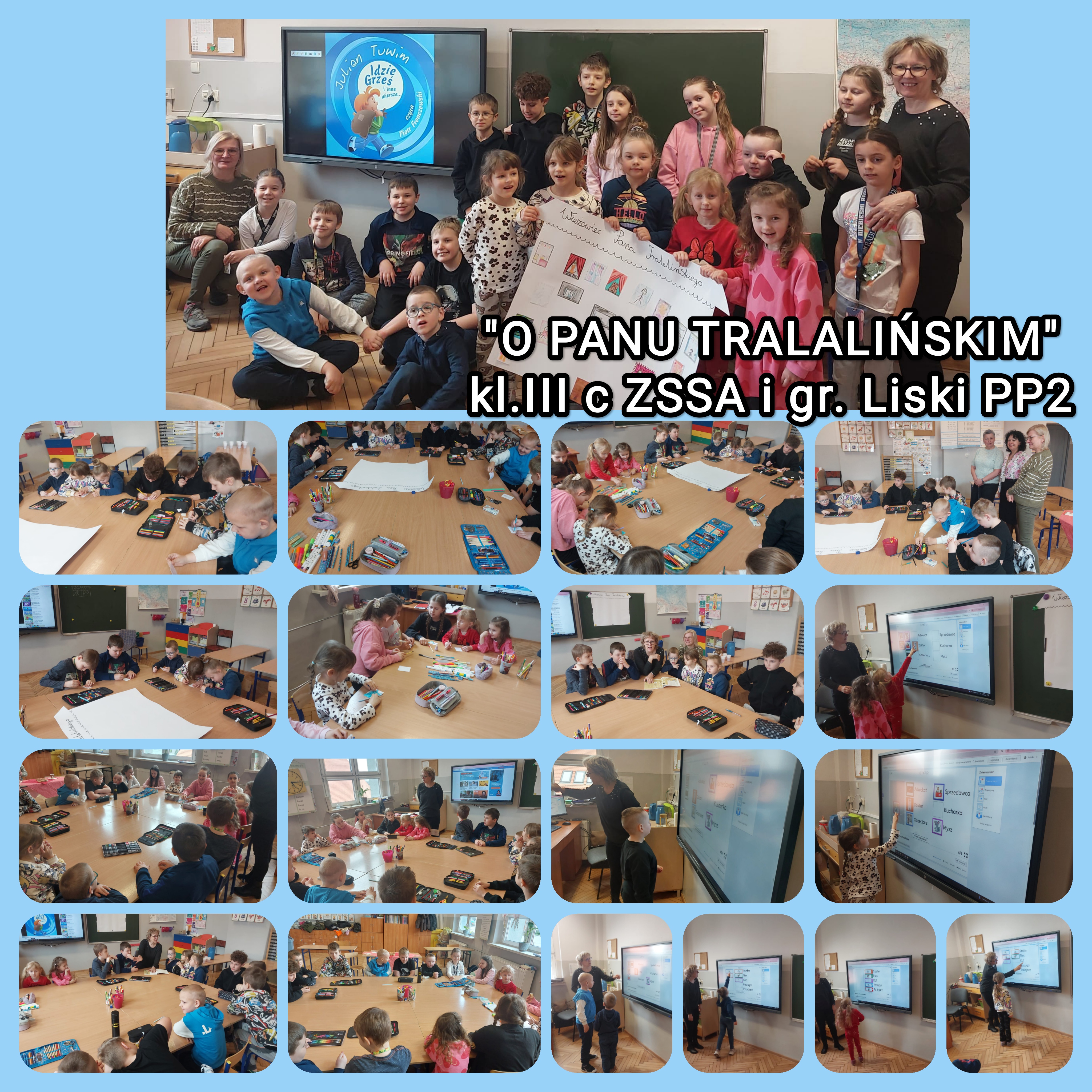 Wszystkie dzieci poznały wiersz J. Tuwima pt. "O Panu Tralalińskim". Należało przedstawić wszystkich sąsiadów głównego bohatera. To było wyzwanie! Kreatywne dzieci wymyśliły także innych sąsiadów przy okazji podśpiewując wesoło. Wszystkim mieszkańcom Śpiewowic przy ulicy Wesolińskiej zapewniono mieszkanie z oknem w wieżowcu Pana Tralalińskiego. Ileż wysiłku i pomysłów malowało się na tych pracach. Wieżowiec był niebywały. Przedszkolacy i Uczniowie włożyli w pracę mnóstwo serca. Na pamiątkę kolejnego wspaniałego spotkania gr. Liski zabrała wspólnie wykonany plakat „Wieżowiec Pana Tralalińskiego” do przedszkola i wyeksponowała na gazetce.